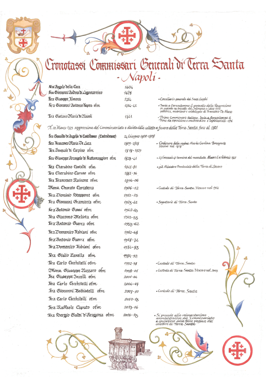 Dal XVIII secolo sono stati molti i Commissari di Terra Santa del Commissariato Generale di Terra Santa di Napoli. Ecco l’elenco storico che documenta la successione dei frati minori che, nei secoli, hanno ricoperto questo importante incarico. Attraverso i loro nomi e i loro volti, rivive l’impegno costante della Custodia di Terra Santa nel promuovere la missione francescana nei Luoghi Santi, in stretta collaborazione con tutti i benefattori del Sud Italia. Una testimonianza di fede, storia e devozione che unisce Napoli alla Terra di Gesù.